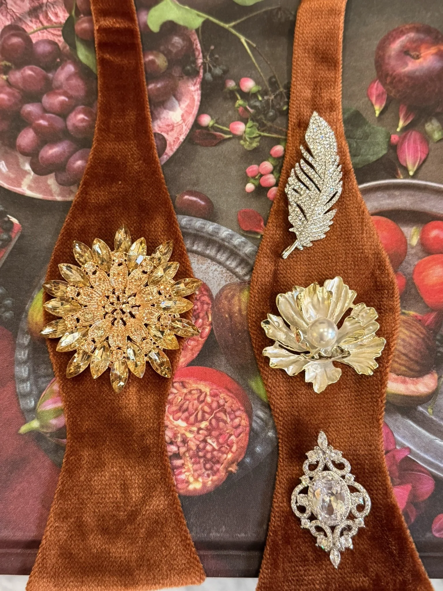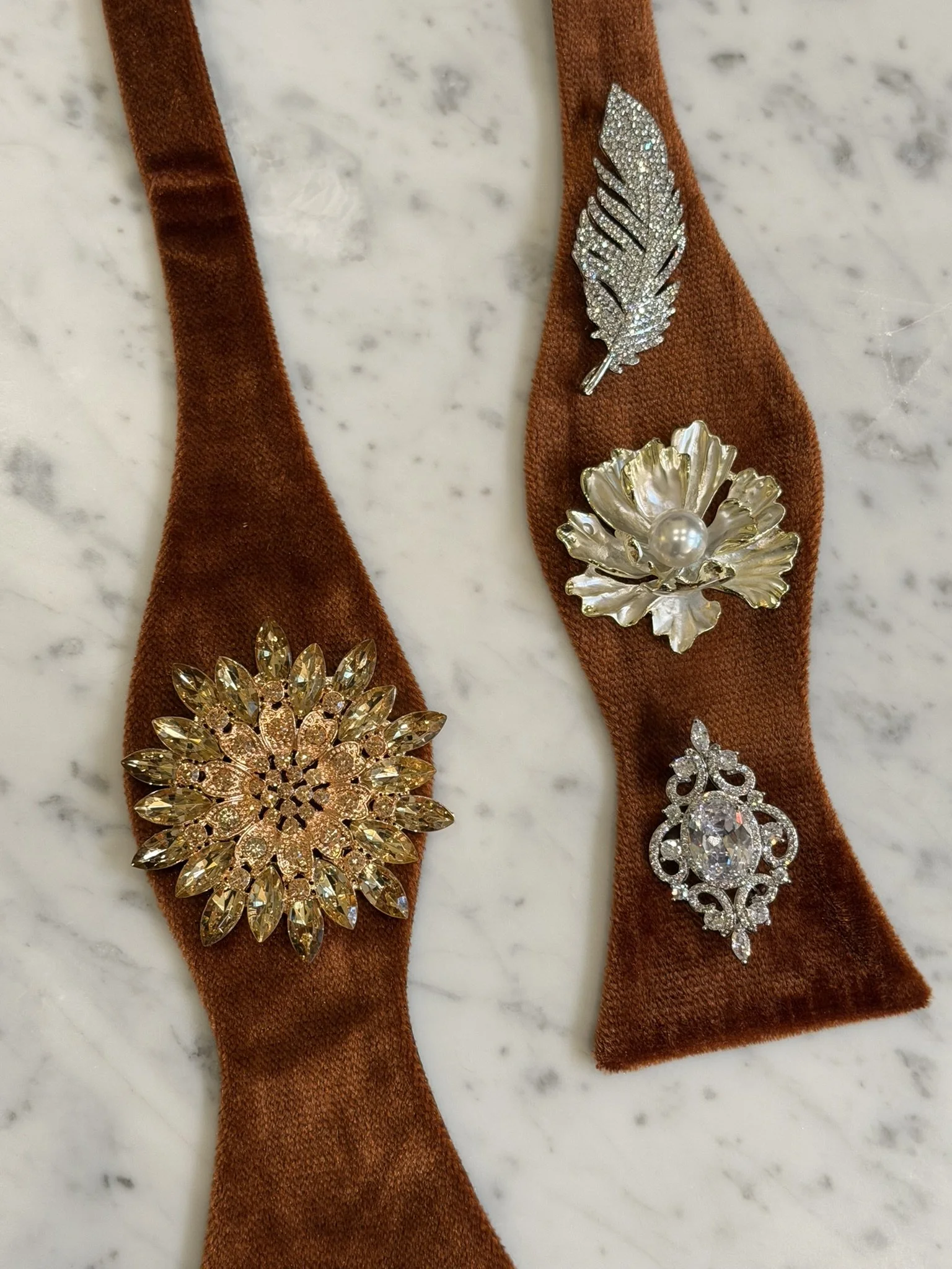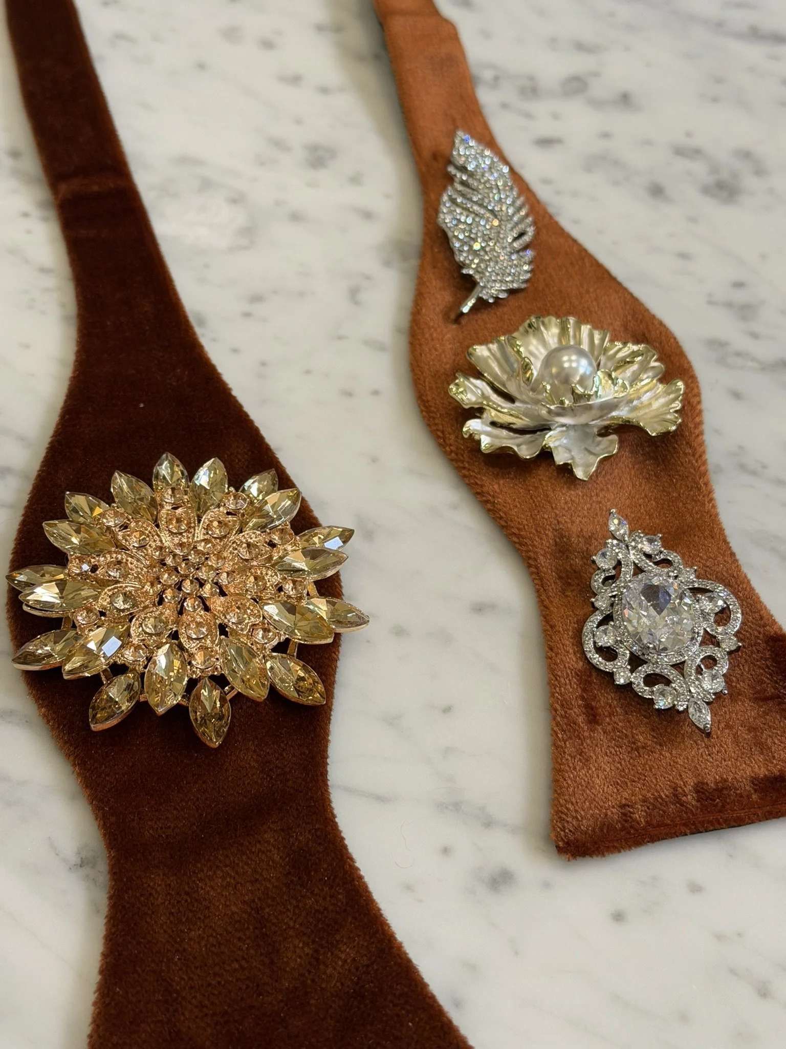 We pair these handcrafted bow bases with a curated collection of vintage and new brooches—sourced from estate markets, private collections and other sources. No two brooches are ever the same, and every combination is assembled with an eye for balance, history, and understated elegance.