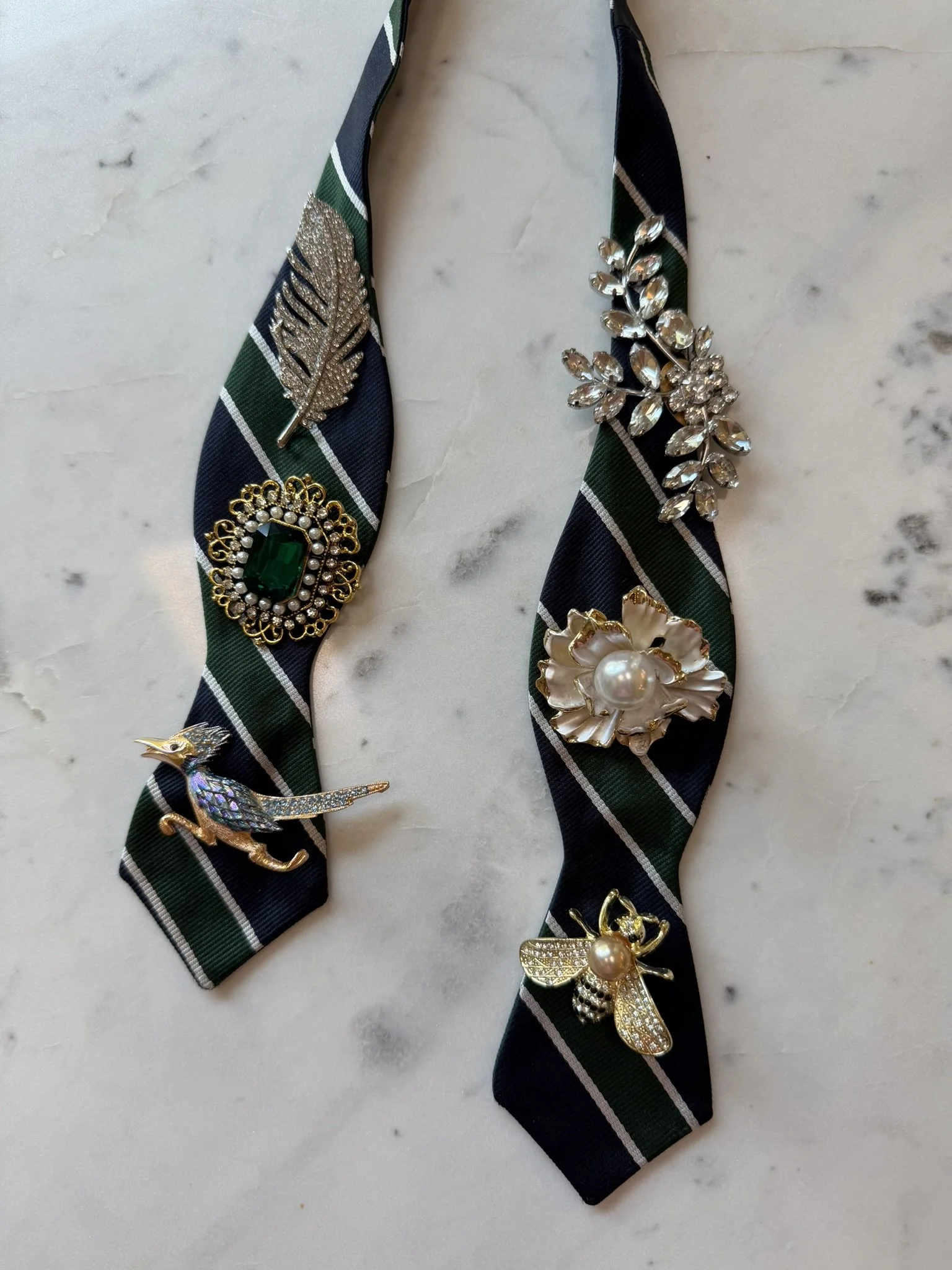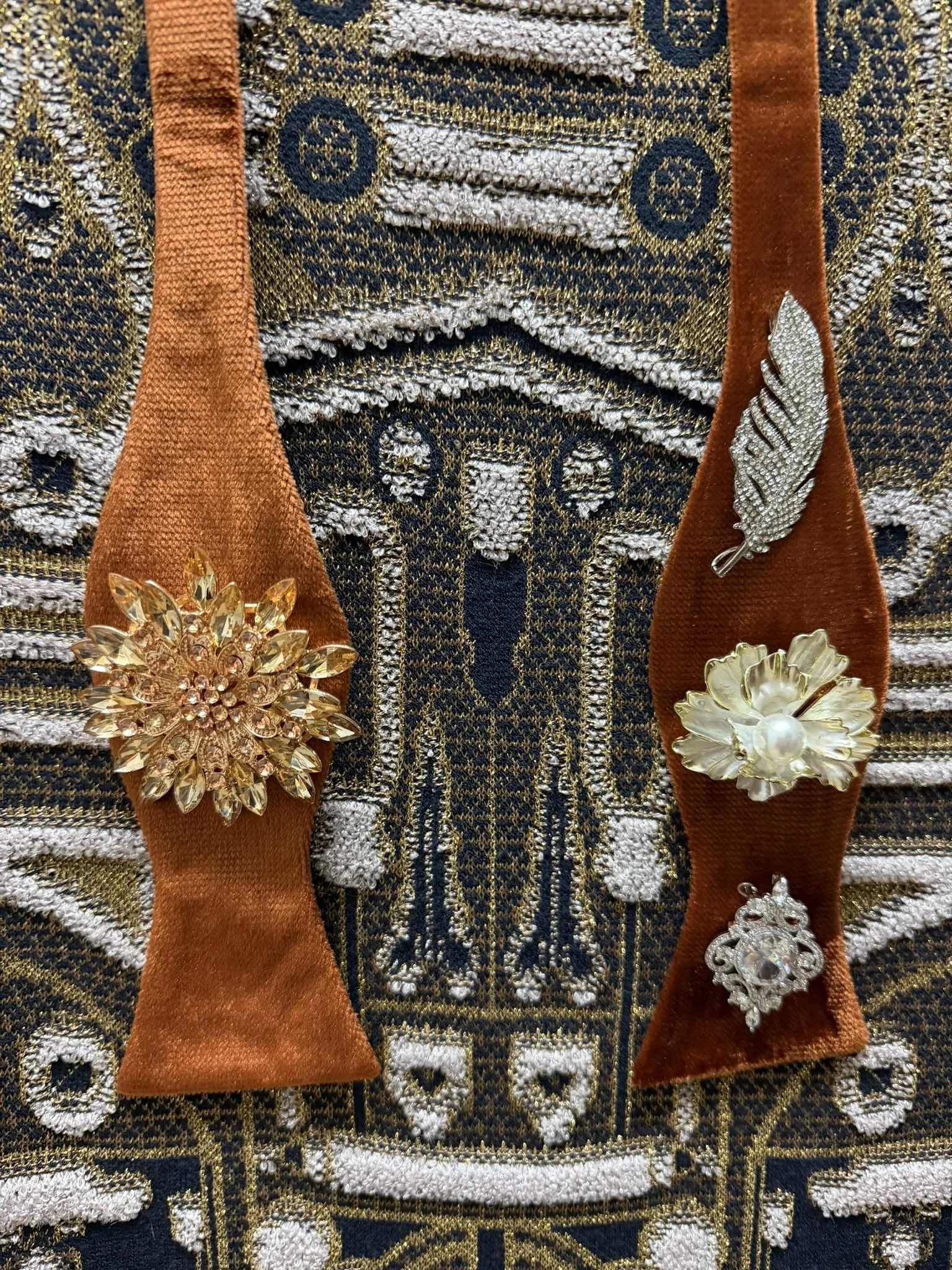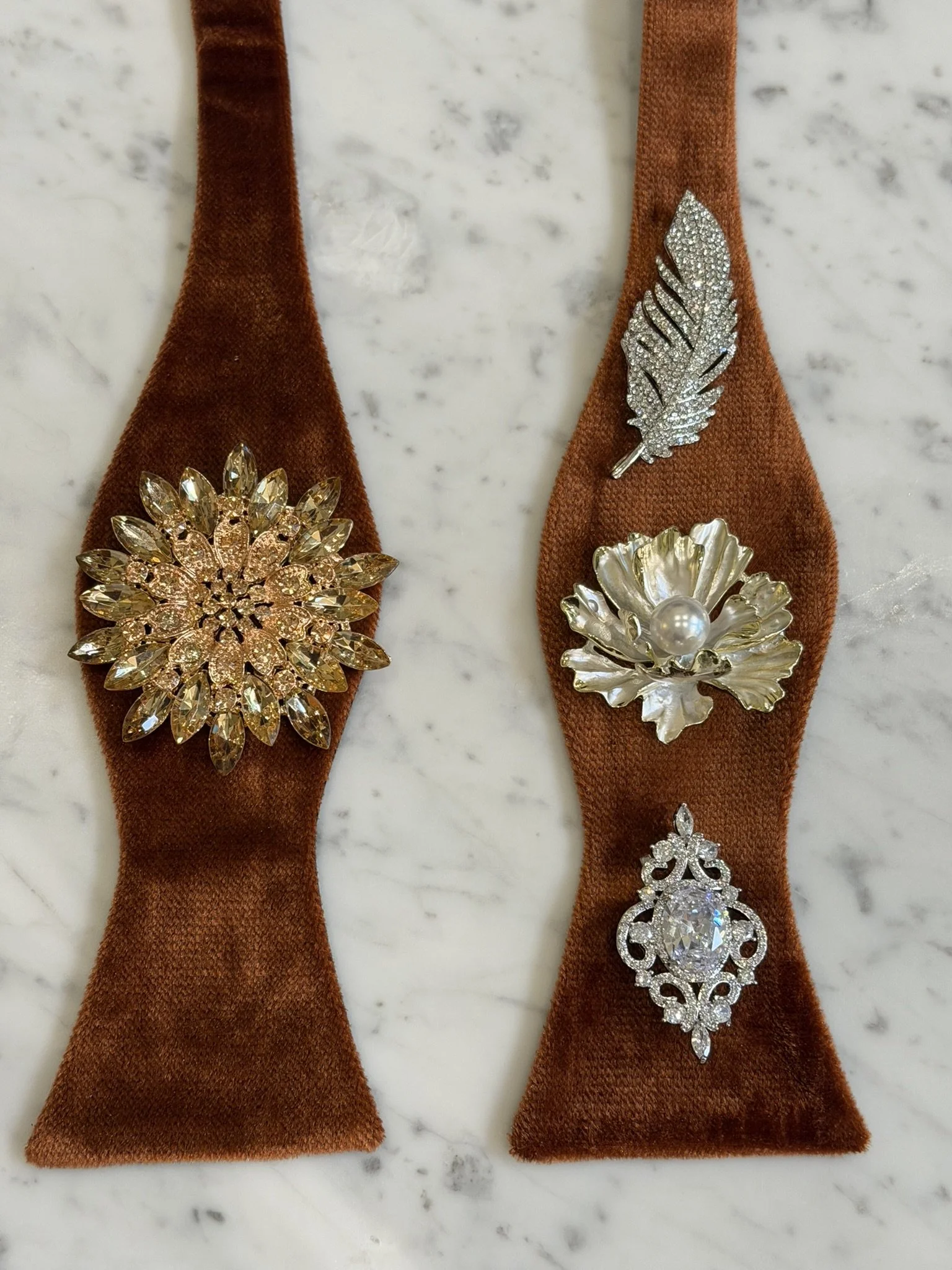 Each Bow & Brooch™ piece begins with a newly crafted bowtie base, designed in small batches using unique fabrics sourced for their structure, drape, and refinement. From crisp rep stripes and textured jacquards to soft velvets and tailored silks, every bow is selected to complement the art of adornment.